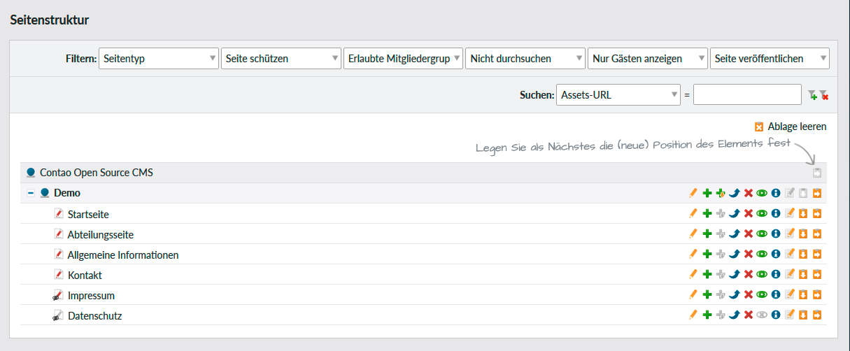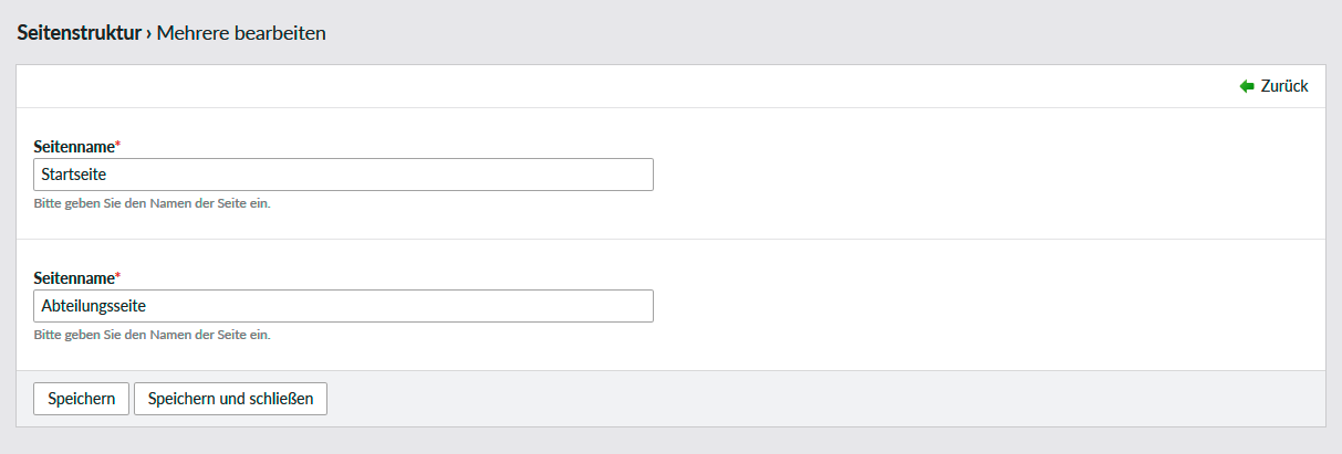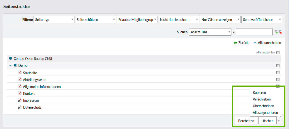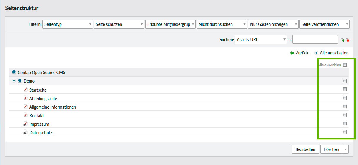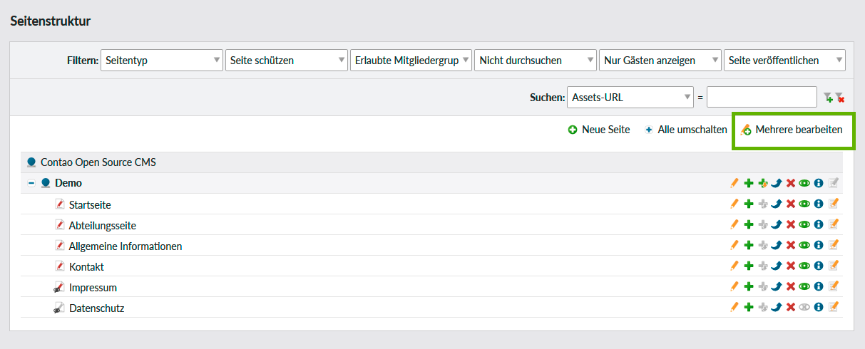 In den verschiedenen Bereichen, die im Aktionsbereich zur Bearbeitung aufgerufen werden können, gibt es auch die Möglichkeit, mehrere Elemente gleichzeitig zu bearbeiten. Wir zeigen hier am Beispiel der Seitenstruktur, wie das funktioniert.