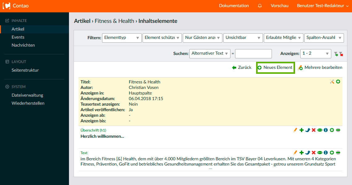 Um ein neues Inhaltselement anzulegen, gibt es 2 Methoden: