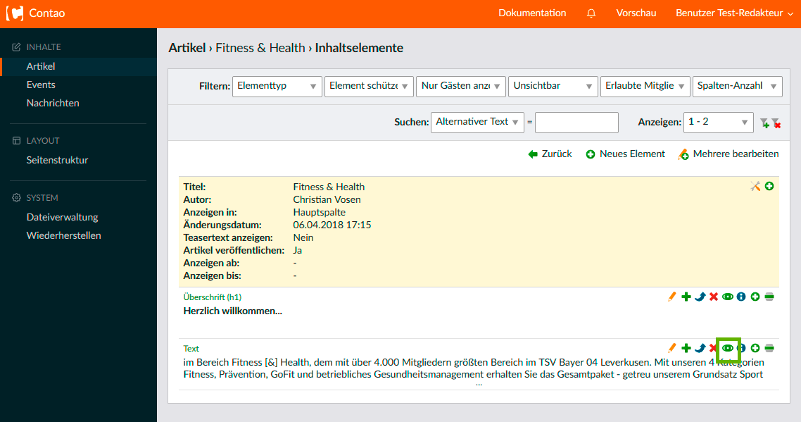 Sobald ein Inhaltselement eingeblendet ist, ist es für den Besucher der Website sichtbar. Ausgeblendete Elemente sind nicht sichtbar für den Besucher.