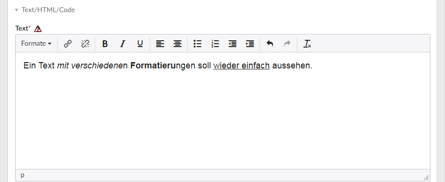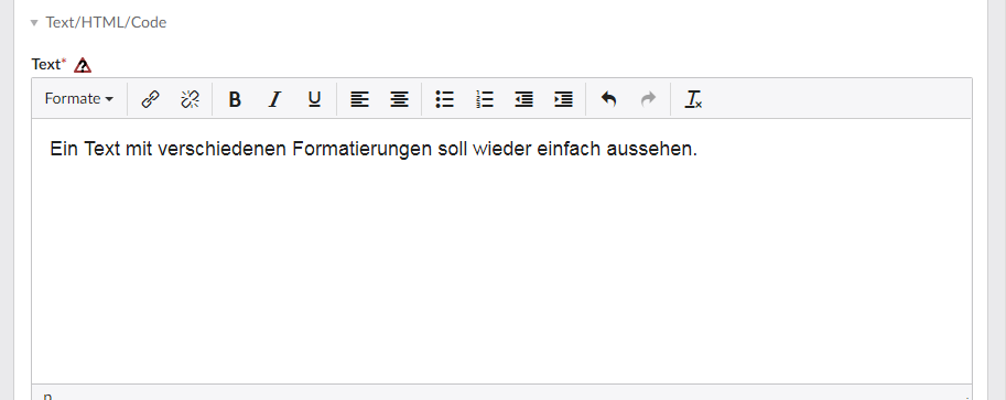 Diese Funktion ist nützlich um unerwünschte Formatierungen im Text zu löschen. Diese können auftreten, wenn Sie z.B Text aus einer anderen Website kopieren und in das Textfeld einfügen, oder Sie Formatierungen angewendet haben die Sie wieder löschen möchten.
