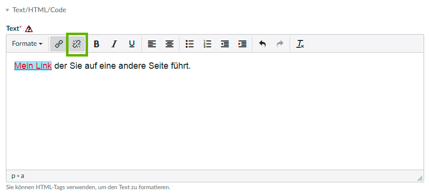 Um verlinkten Text zu entfernen, klicken Sie mit der Maus in den verlinkten Bereich. Die beiden Link Symbole färben sich dunkel.