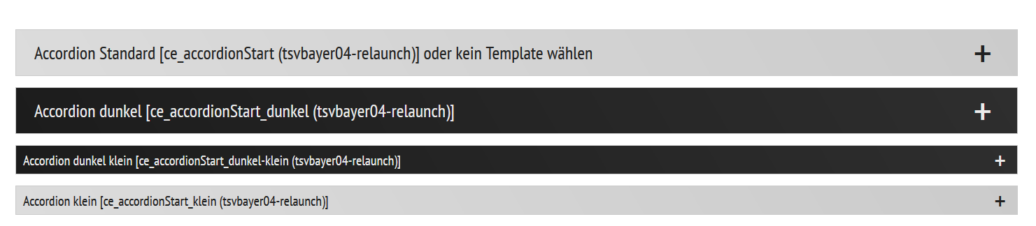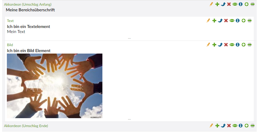 Mit dem Inhaltselement Akkordion lassen sich Inhalte "verstecken", und platzsparend einbinden. Der Besucher der Website kann sich die Inhalte auf Klick anzeigen lassen.