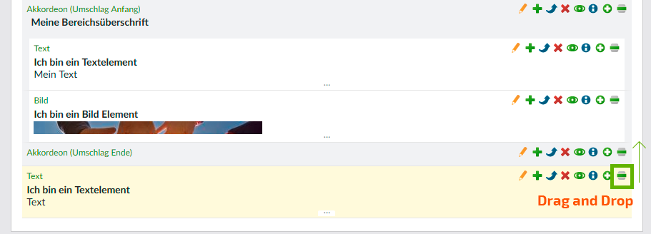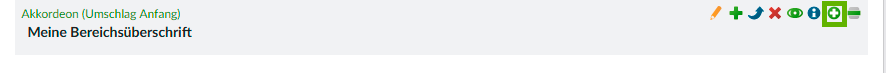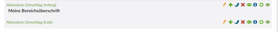 WICHTIG: Sie müssen den Umschlag für das Akkordeon zwingend wieder schließen. Dazu benötigen Sie das schließende Element Umschlag Ende. Klicken Sie am besten auf das Symbol Danach einfügen in den Bearbeitungsmöglichkeiten des eben erstellten Umschlag-Start Elementes.