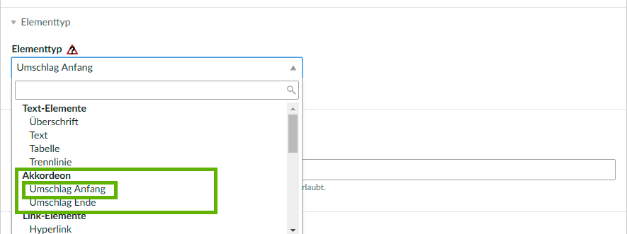 Wählen Sie in der Elementtyp Auswahl das Element Akkordeon, dann Umschlag Anfang: