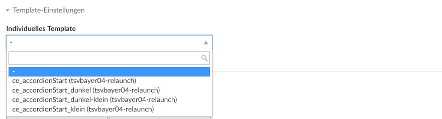 Wählen Sie nun ein Template, um die Optik des Akkordions zu bestimmen. Die Beispiele für das Aussehen finden Sie weiter oben in diesem Kapitel.