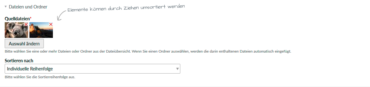 Sie können die Bilder auch sortieren. Im Feld Sortieren nach werden Ihnen verschiedene Optionen angeboten. Als Standard ist dort Individuelle Reihenfolge eingestellt. In diesem Fall können Sie die Miniaturansichten per Drag and Drop in die Reihenfolge bringen, die Sie sich wünschen. Die anderen Optionen sortieren die Bilder wie angegeben automatisch.