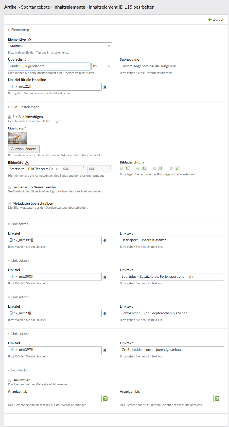 Das Element Multilink steht nicht jedem Redakteur zur Verfügung. Es lassen sich 5 Seiten verlinken und ein Bild ergänzen. Dieses Element findet sich auf der Startseite sowie den Landingpages der Abteilungen.