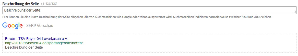 Unterhalb des Feldes wird eine simulierte Vorschau eines Suchergebnisses (konkret bei Google) angezeigt, die den Titel und die Beschreibung der Seite angibt.