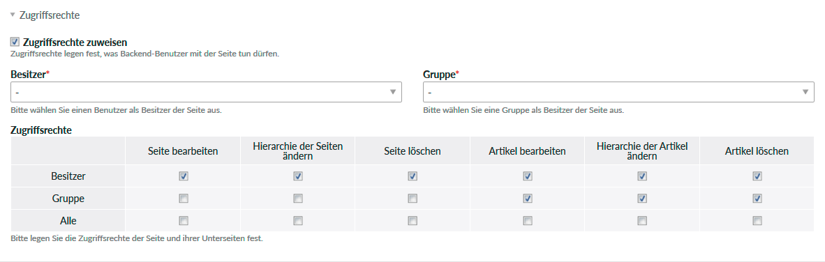 Hier legen Sie fest, welche Backenduser die Seite bearbeiten dürfen bzw. welche Rechte Sie in Bezug auf die in der Seite enthaltenen Inhalten haben.