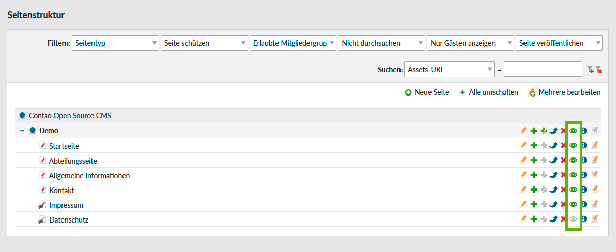 Im Backend hingegen ist die Seite zu sehen und auch zu bearbeiten. Um eine Seite zu veröffentlichen oder zu deaktivieren, klicken Sie im Aktionsbereich der Seitenstruktur auf das "veröffentlichen/unveröffentlichen" Symbol. Wenn das Symbol ein grünes Auge ist, ist die Seite veröffentlicht. Ein graues Auge signalisiert, das die Seite deaktiviert ist.